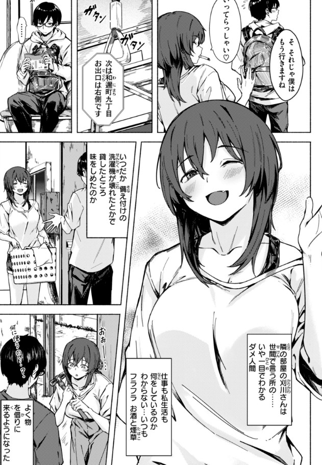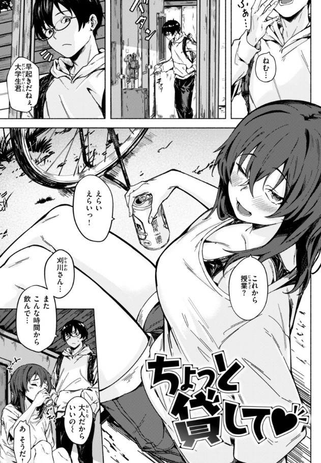 『ちょっと貸して』 年上なのに、毎日の暮らしがなんだか上手くいかない刈川さんは、隣に住む大学生の男の子に、いつも助けてもらってる。シャンプー切らしたとか、電球変えてとか、細かいことばっかり頼んじゃって、気づいたら借りが山積み。彼女、顔を赤らめながらも、ちゃんと返さなきゃって思うんだよね。で、結局、自分の体でその借りを清算しようって決意しちゃう。最初はぎこちないけど、だんだんお互いの温もりが心地よくなって、夜の部屋で静かに寄り添う時間が増えていく。刈川さんの柔らかい肌が触れるたび、大学生くんはドキドキが止まらなくて、彼女の優しい笑顔にすっかり夢中。借りを返すはずが、なんだか新しい関係が芽生えちゃったみたい。