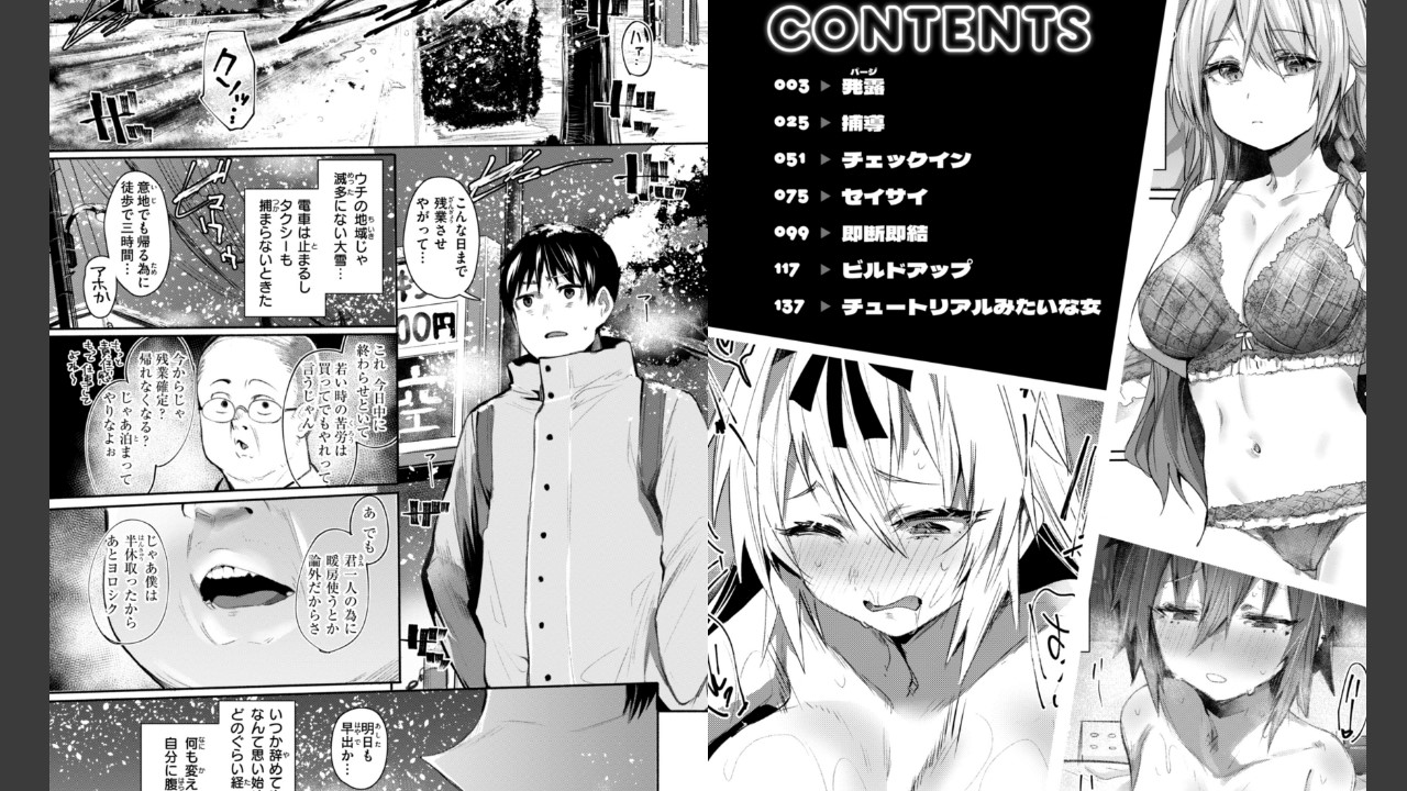 『チュートリアルみたいな女』 特殊なコンタクトレンズで他人の認識を改変できるってアイテムを手に入れた主人公、拓海、23歳。失敗続きで手痛い目にあうけど、成功率98.6%のお姉さん、れいか、27歳が現れて。チュートリアルみたいに、彼女が導いてくれて、認識改変の力で二人だけの世界を作っちゃう。れいかの体、柔らかく包み込んで、拓海の失敗を全部許すみたいに熱く。描き下ろしで、レンズの効果のビジュアルが増えて、ファンタジーっぽいのに生々しい。最後、れいかが「これで君のものよ」って、永遠に続くみたいな余韻。