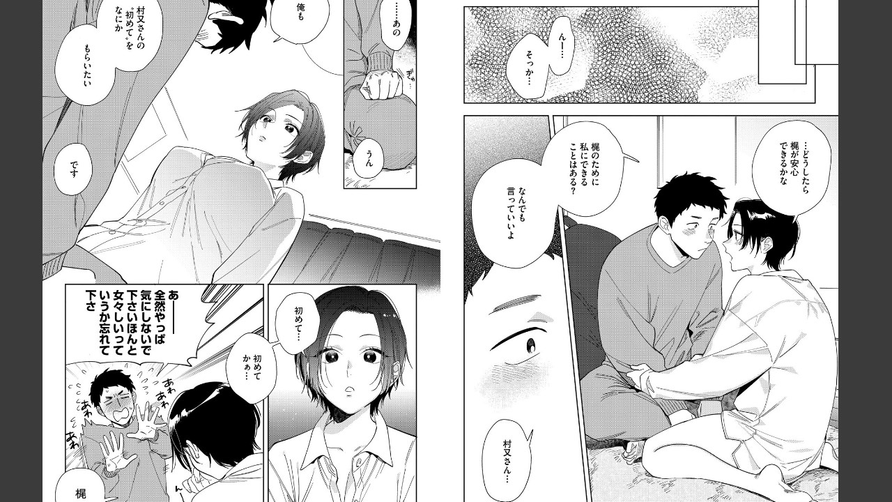 付き合い始めて一年ちょっと。 最初は飲み会の帰り、酔った勢いでキスしたのがきっかけだった。あのとき村又さんが「梶くんって、意外と強引だよね」って笑った顔が、今でも頭から離れない。