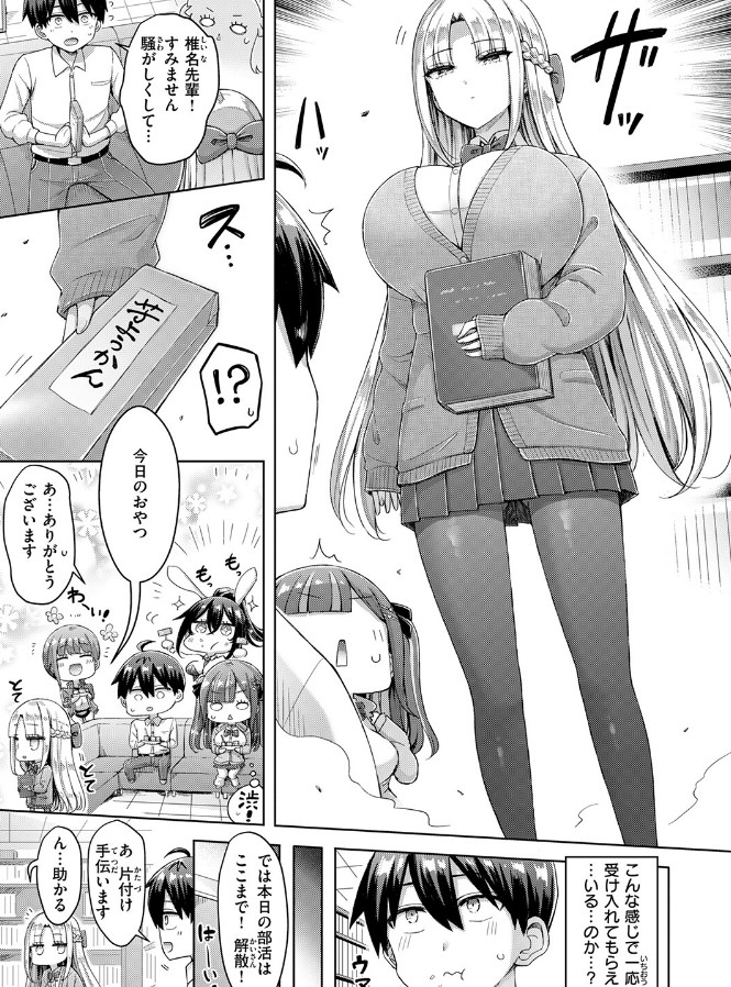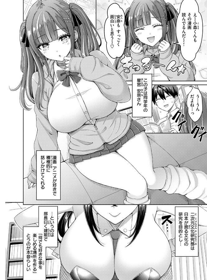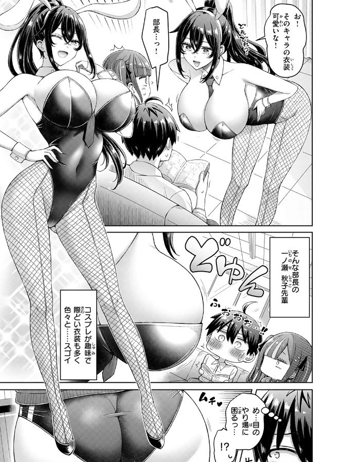 せめて趣味の合う部なら居場所が出来るかもと思い《二次元文化研究部》に入部したものの、距離感が近すぎる巨乳地雷系女子の杏奈(あんな)に、コスプレが趣味で平然とバニー衣装で過ごす部長の秋子(しゅうこ)先輩、常にブルマ姿で天然ボクっコな昔馴染みの彩羽(いろは)……と、個性の強すぎる女子たちに囲まれ、目のやり場に困る毎日を送っていた。
