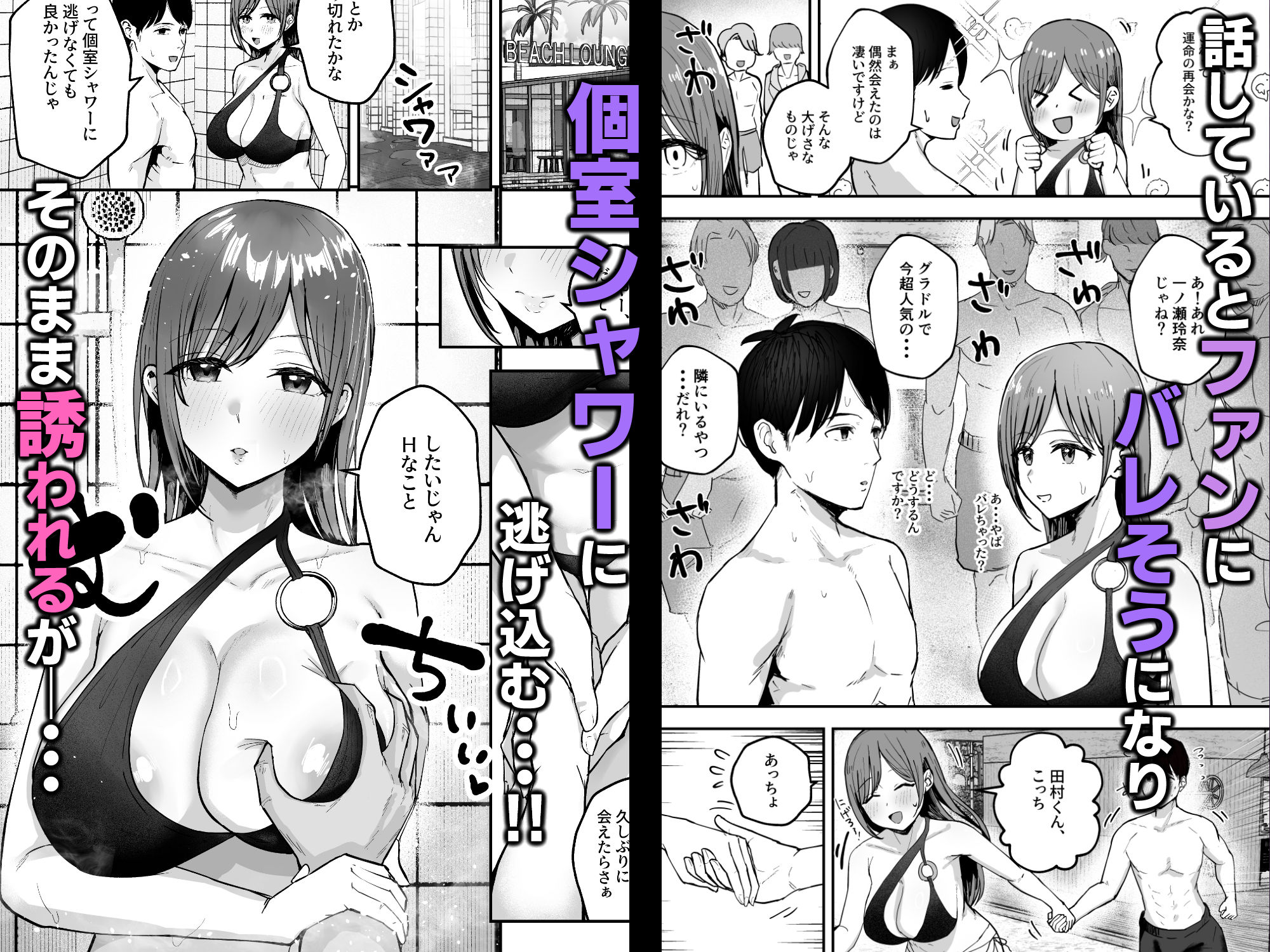 話が弾む間もなく、ファンの波が押し寄せてきた。スマホのフラッシュが瞬き、押し合う人ごみの中で俺たちは孤立無援に。「逃げよ!」あかりが俺の手を掴み、素早く海の家の裏手へ。息を切らして駆け込んだ先は、個室シャワー室。扉を閉め、鍵をかける。外からはまだざわめきが聞こえてくる。狭い空間に二人の息遣いが響き、湿った空気が肌にまとわりつく。「ふう……危なかったね。ありがとう、助けてくれて」あかりが息を弾ませ、俺の腕に寄りかかる。彼女の体温が、薄い水着越しに伝わってくる。むちむちとした柔らかな感触が、俺の理性を揺さぶる。